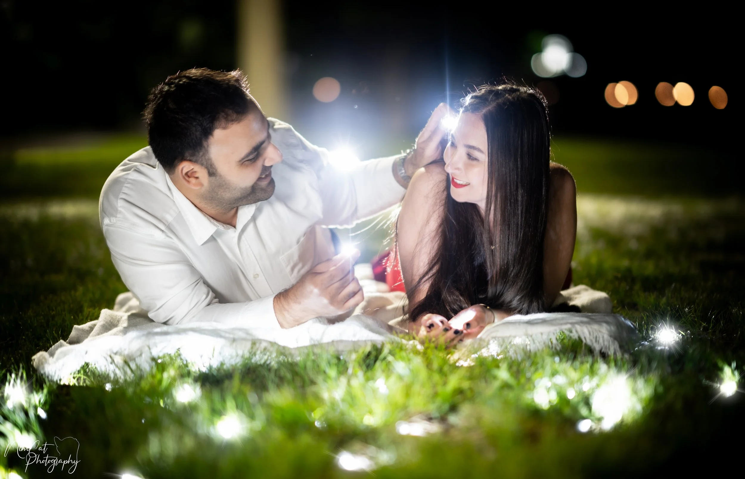 A couple lying on a blanket in a park at night, smiling and enjoying each other's company, with twinkling lights around them.